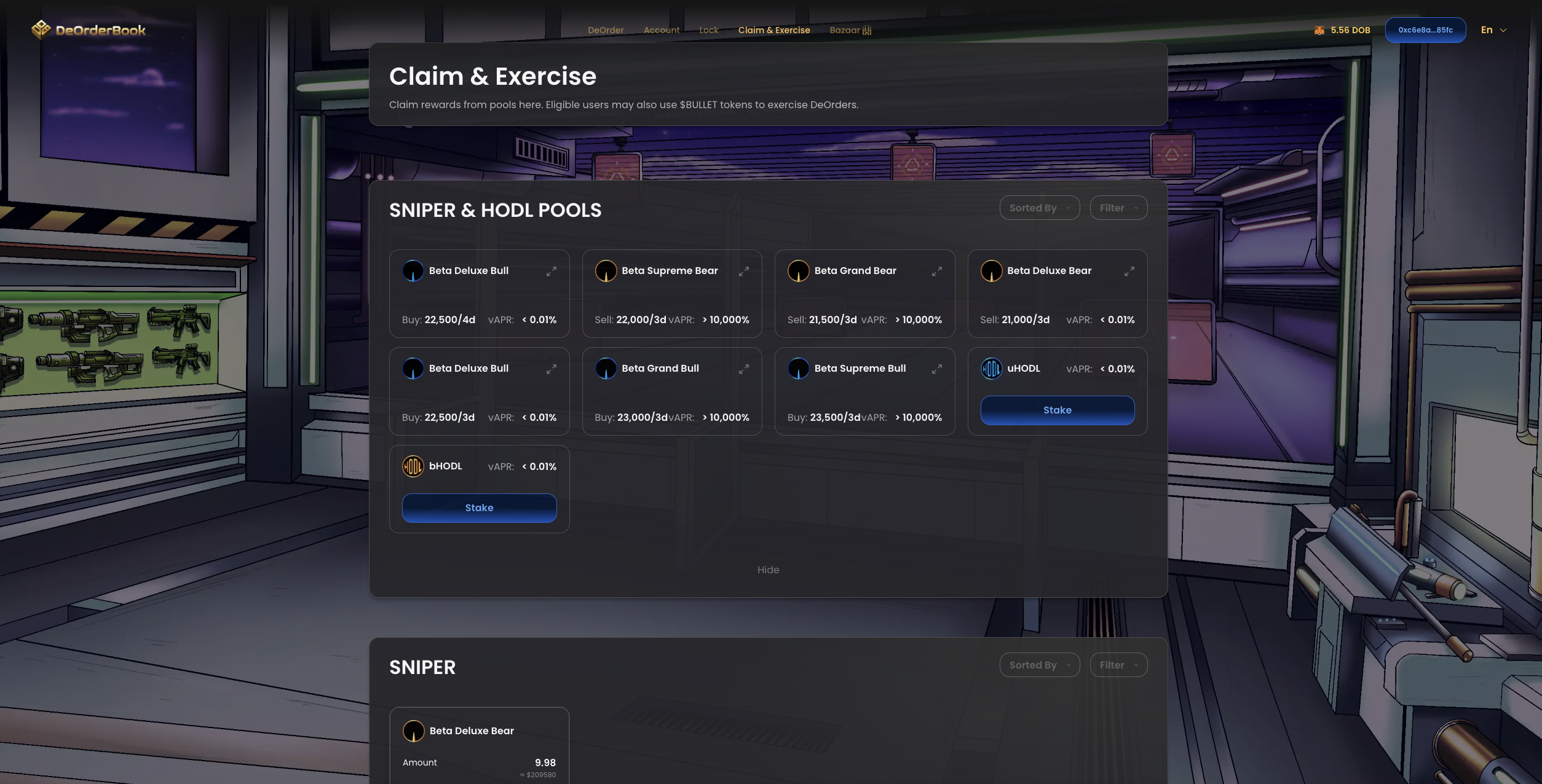 * Users can use [earned BULLET tokens](https://deorderbook-1.gitbook.io/deorderbook-docs/sniper-and-bullet/obtaining-and-trading-bullet) to exercise DeOrders for additional profits