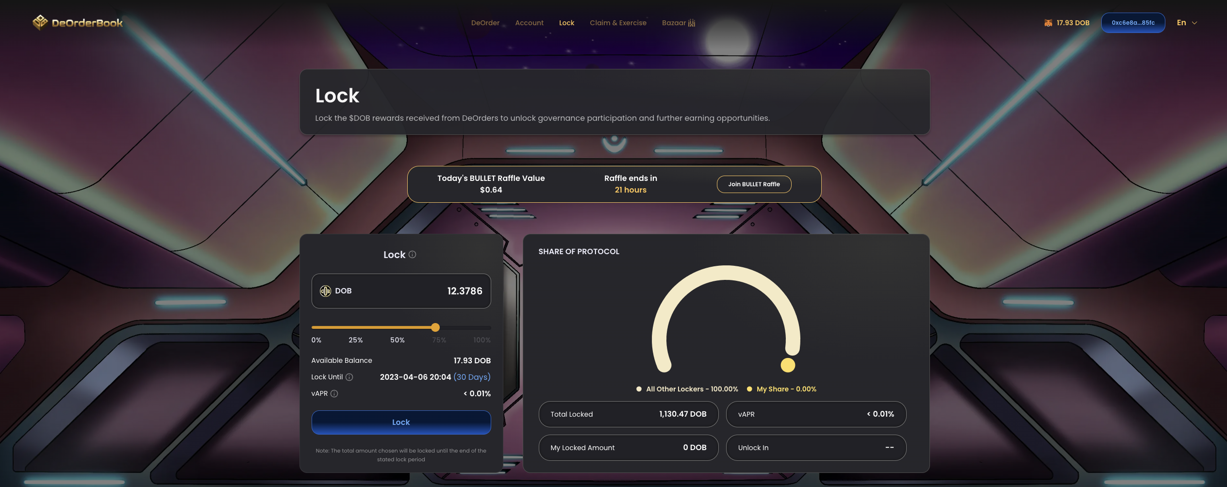 On the Lock page, users that hold [Gerege NFTs](https://github.com/DeOrderBook/deorderbook-docs/blob/main/dob-website/broken-reference/README.md) can lock the [$DOB](https://github.com/DeOrderBook/deorderbook-docs/blob/main/dob-website/broken-reference/README.md) rewards they've received from [placing DeOrders](https://deorderbook-1.gitbook.io/deorderbook-docs/deorders/explaining-a-deorder). Rewards are given out in proportion to the amount of $DOB you've staked, so make sure to take a look the reward ratio to see how much you're entitled to earn compared to other users on DeOrderBook.\