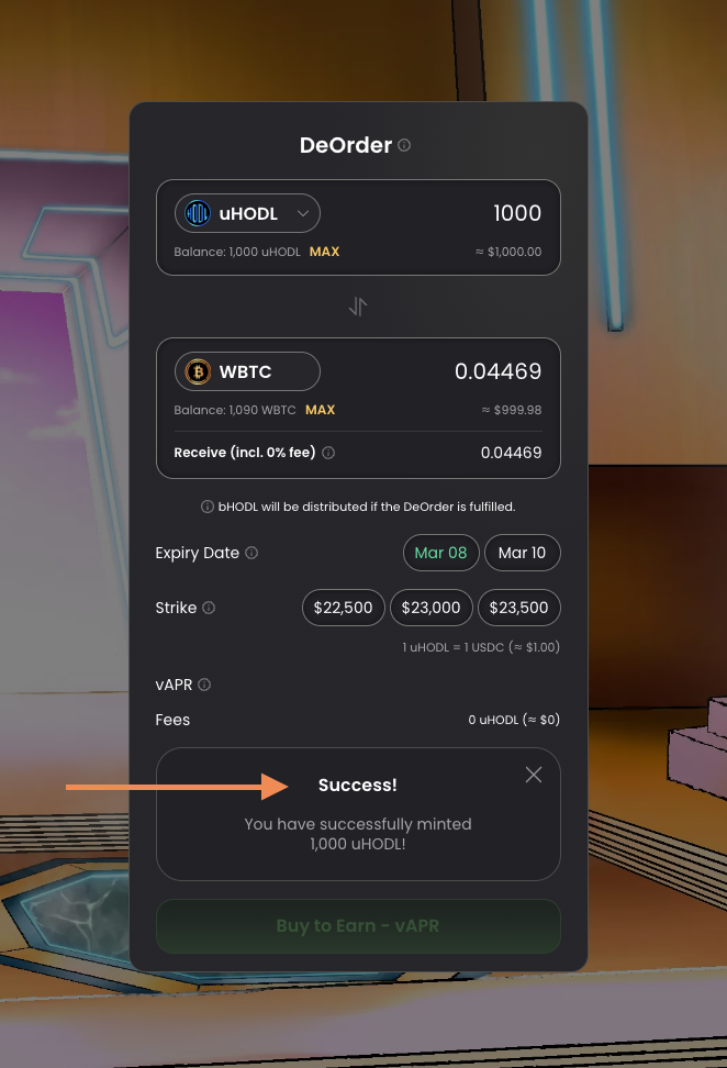 5. Now that uHODL tokens have been minted, users a ready to [place a DeOrder](https://deorderbook-1.gitbook.io/deorderbook-docs/deorders/placing-a-deorder).