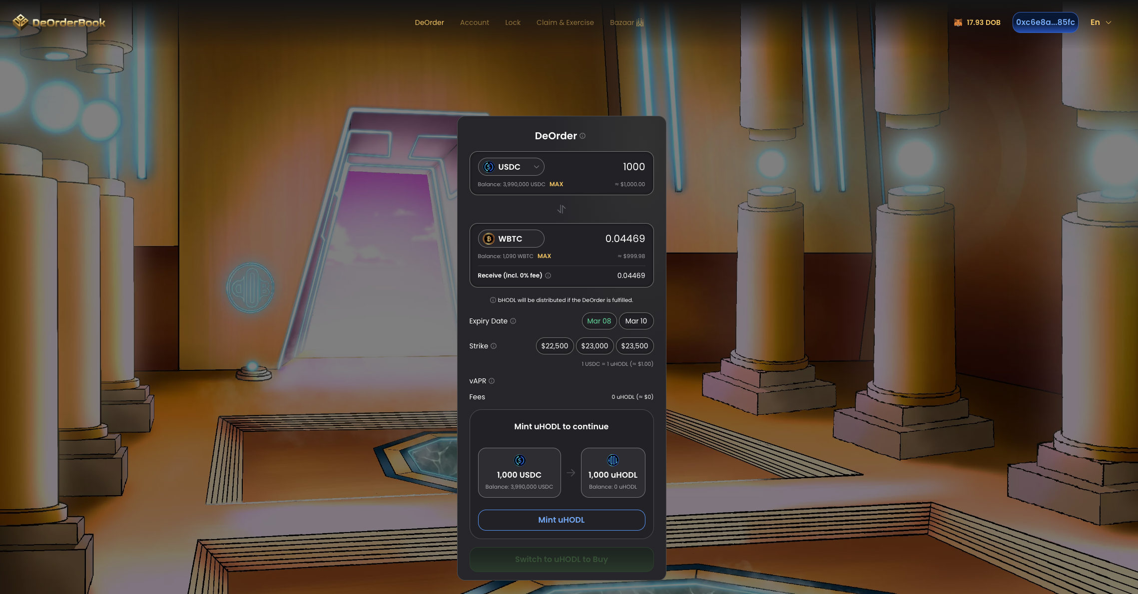 3. On the DeOrder page, select an amount of supported cryptocurrency you'd like to use for minting HODL tokens. In the below example, 1000 `$USDC` is being used to mint 1000 `uHODL`.