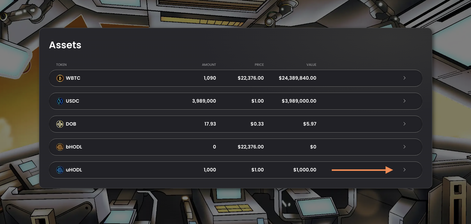 4. Look for the HODL token type you'd like to stake, then click on the small white arrow to the right to see a drop-down menu describing all the actions you can take with your HODL tokens.