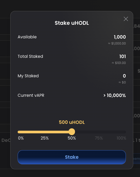 Use the slider to select the percentage HODL tokens you want to stake. When you're satisfied, click the 'Stake' button.