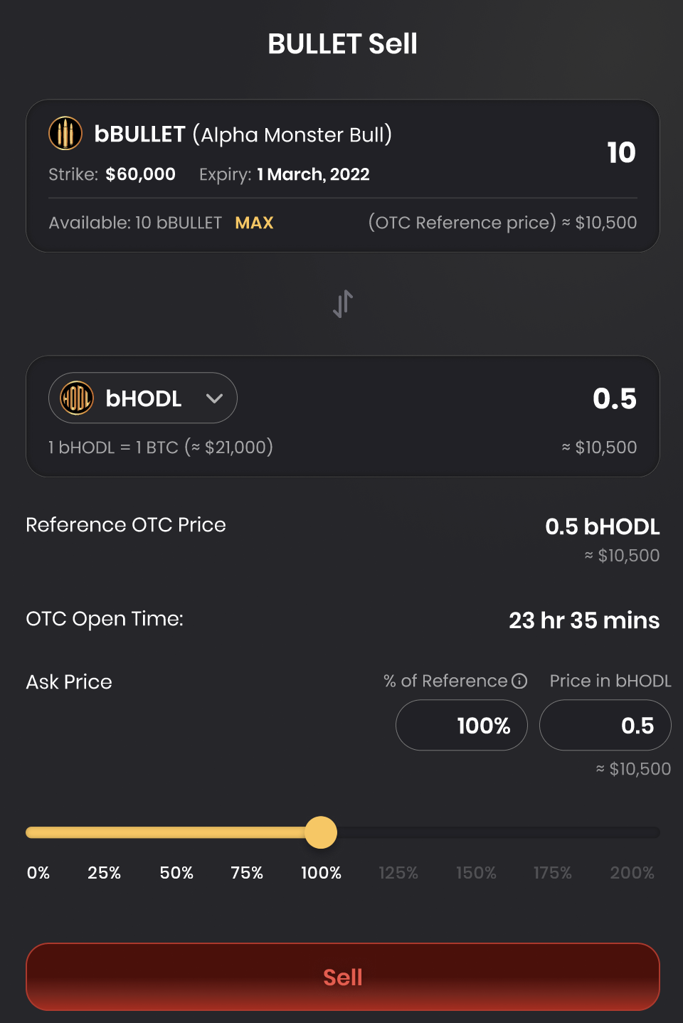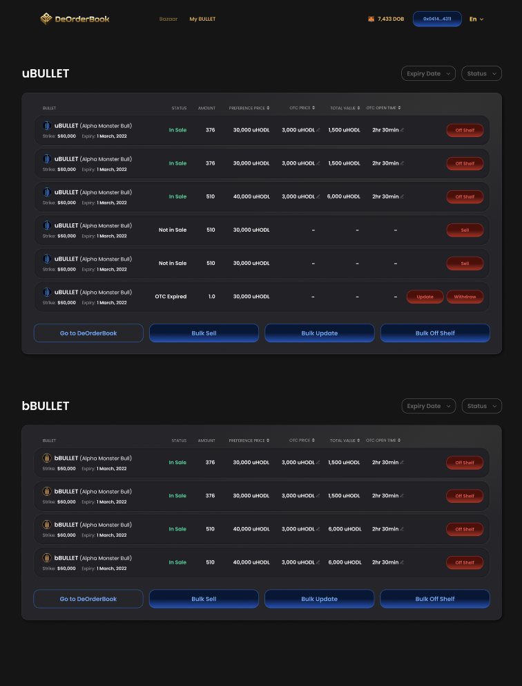 At the BULLET Bazaar, users are able to view all the BULLETs available for sale: together with parameters such as the exercise date, exercise price, OTC open times and OTC prices.\